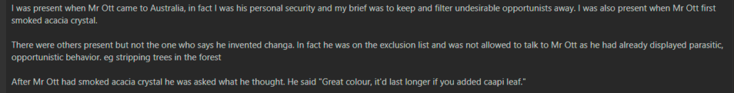 In questo post di DMT nexus Palmer viene messo spalle a muro ed è costretto ad ammettere che c’erano tante misture fumabili infuse con DMT ed alcaloidi armalinici prima che esplodesse il fenomeno changa nel 2003. Quindi è costretto ad insistere sulla stessa definizione di changa, trasformardola in un preciso mix di erbe secche che deve necessariamente contenere la liana essiccata di B. caapi e di cui lui avrebbe scoperto la specifica alchimia.