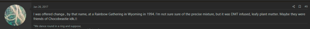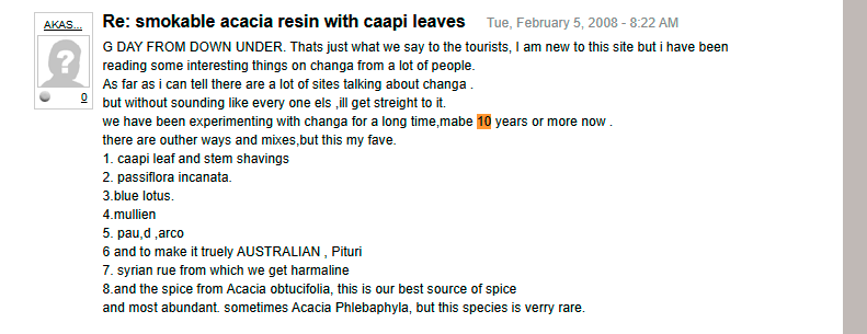 In questo post pubblicato nel 2008 su tribe.net, un forum di psiconautica ormai chiuso, un utente Australiano dice che sono più di 10 anni che sta facendo esperienza con la “changa”.
