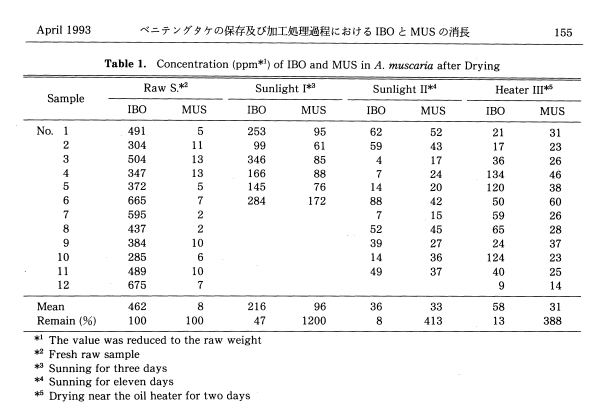 -Essiccandolo a caldo artificialmente a 40C° l’acido ibotenico diminuisce leggermente mentre il muscimolo aumenta di circa 10 volte; a 80C° il primo composto diminuisce fino a meno del 20% mentre il secondo arriva al 650% del contenuto di partenza. A 120C° restano solo tracce di acido ibotenico e il muscimolo viene ridotto di circa il 50%.