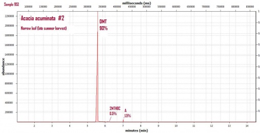 Acacia acuminata è una delle specie australiane più note per l’estrazione di triptamine allucinogene. La corteccia può contenere fino all’1,6% di DMT sul peso secco, e i fillodi (foglie modificate) fino all’1,2%.